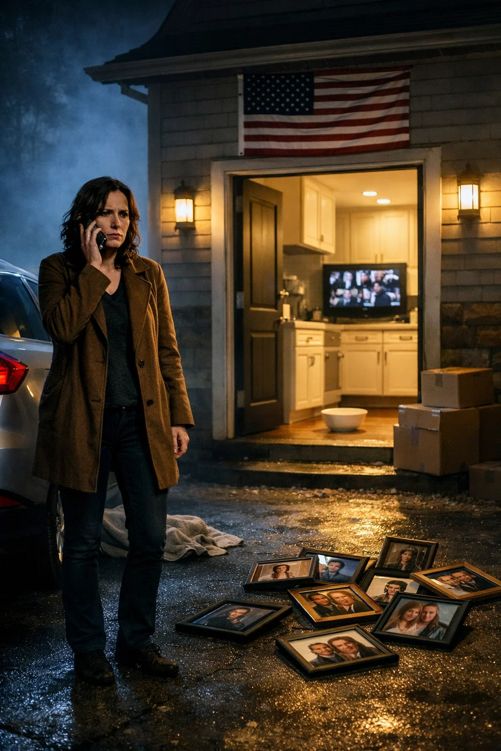 I felt it before I even shifted the car into park. My headlights cut across the driveway and illuminated shapes that didn’t belong outside — collapsed boxes, blankets dragging in the dirt, glass frames catching the light like shards. Then I saw my coat. My photo albums. A storage bin with my handwriting across the side. Four days away for work — and everything that made up my life was sitting in the yard like a clearance pile. The front door looked assaulted. The metal around the lock bent outward,…
