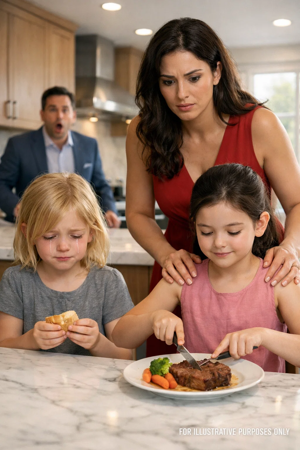 “Mom… can I have a little more, or is that it?” Her voice was so soft it nearly disappeared beneath the low hum of the refrigerator. She was seven years old, sitting at a long polished oak table in an immaculate home in Westlake Village, California — the kind of house that smelled like lemon cleaner, expensive candles, and dinner straight from the oven. And yet her plate held only a slice of dry bread… and a glass of water. Across from her, her stepsister Madison — eight years old, pink cheeks,…