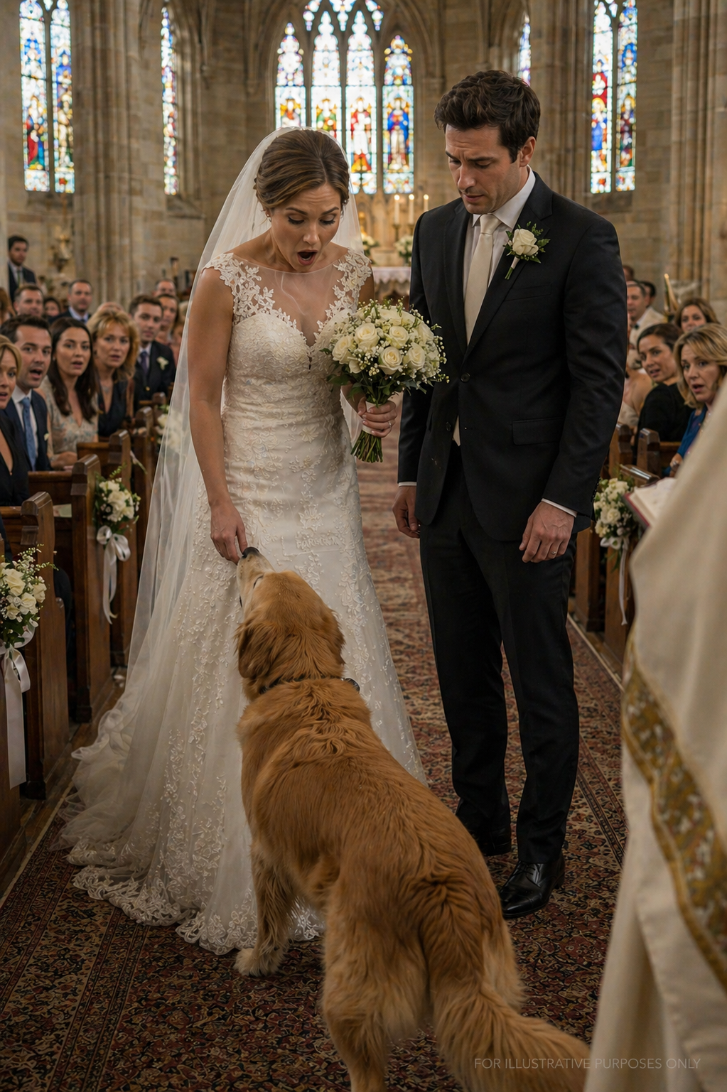 At the Wedding, the Dog Grabbed the Bride’s Dress—What Happened Next Left Everyone Speechless The church looked like something out of a dream. Soft golden sunlight streamed through the tall stained-glass windows, painting the white marble floor in gentle colors. A quiet melody from the organ drifted through the air, wrapping around the guests as they sat in neat rows, waiting for the ceremony to begin. Everything felt perfect. Timeless. At the front stood the bride. Her fingers trembled slightly as they wrapped around a bouquet of ivory roses. She…