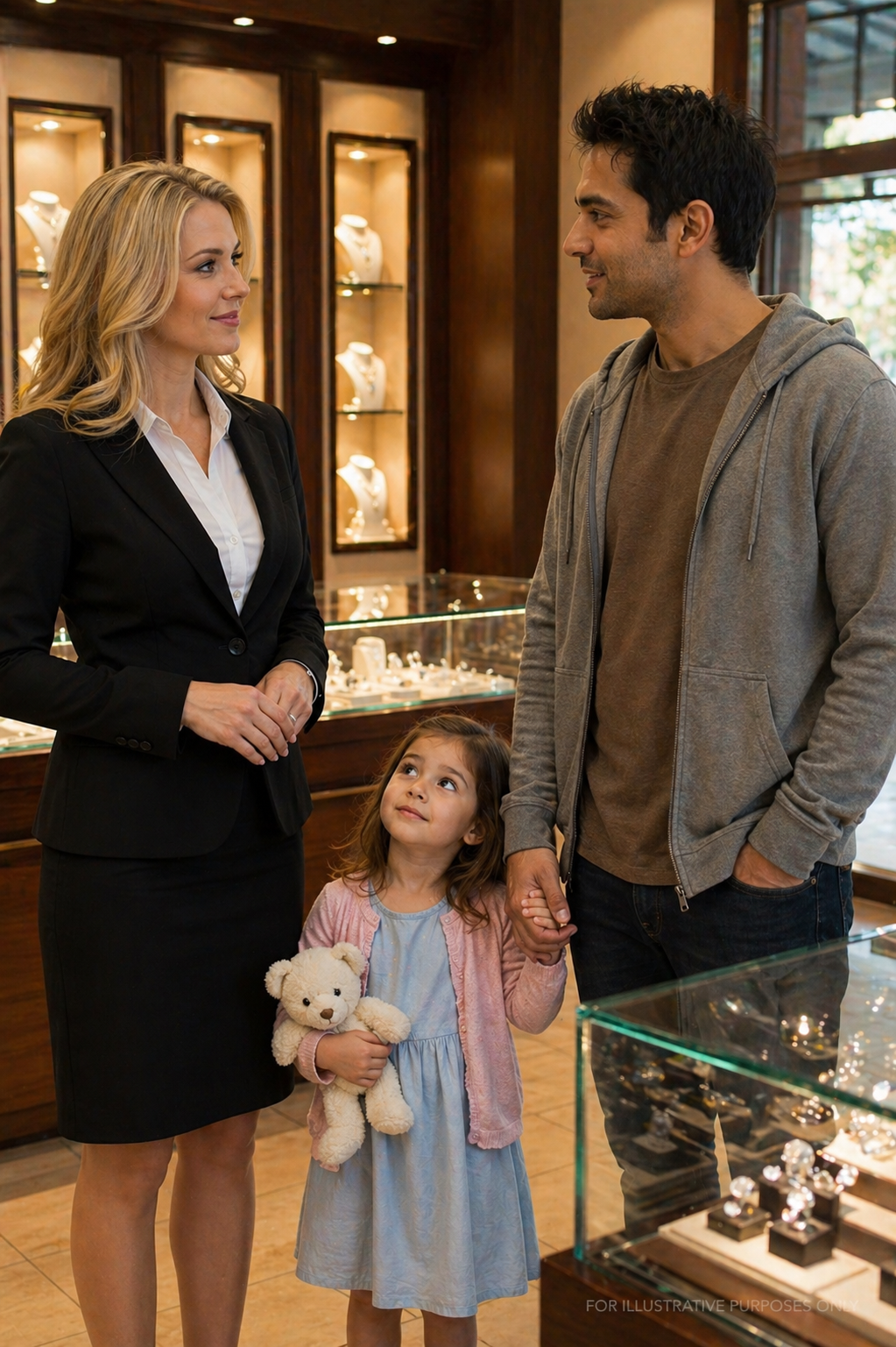 The father whispered, “Please… not in front of my daughter.” The older man’s voice shook. “But sir, this store belongs to you.” The saleswoman turned pale. The little girl looked up, confused. “Daddy?” The father knelt beside her and opened his old wallet. Inside was a faded photo of the same jewelry store… and her mother standing in front of it. He whispered, “Your mom built this place for you.” Then the older man placed a velvet box on the counter. Inside was a necklace engraved with her name. The…