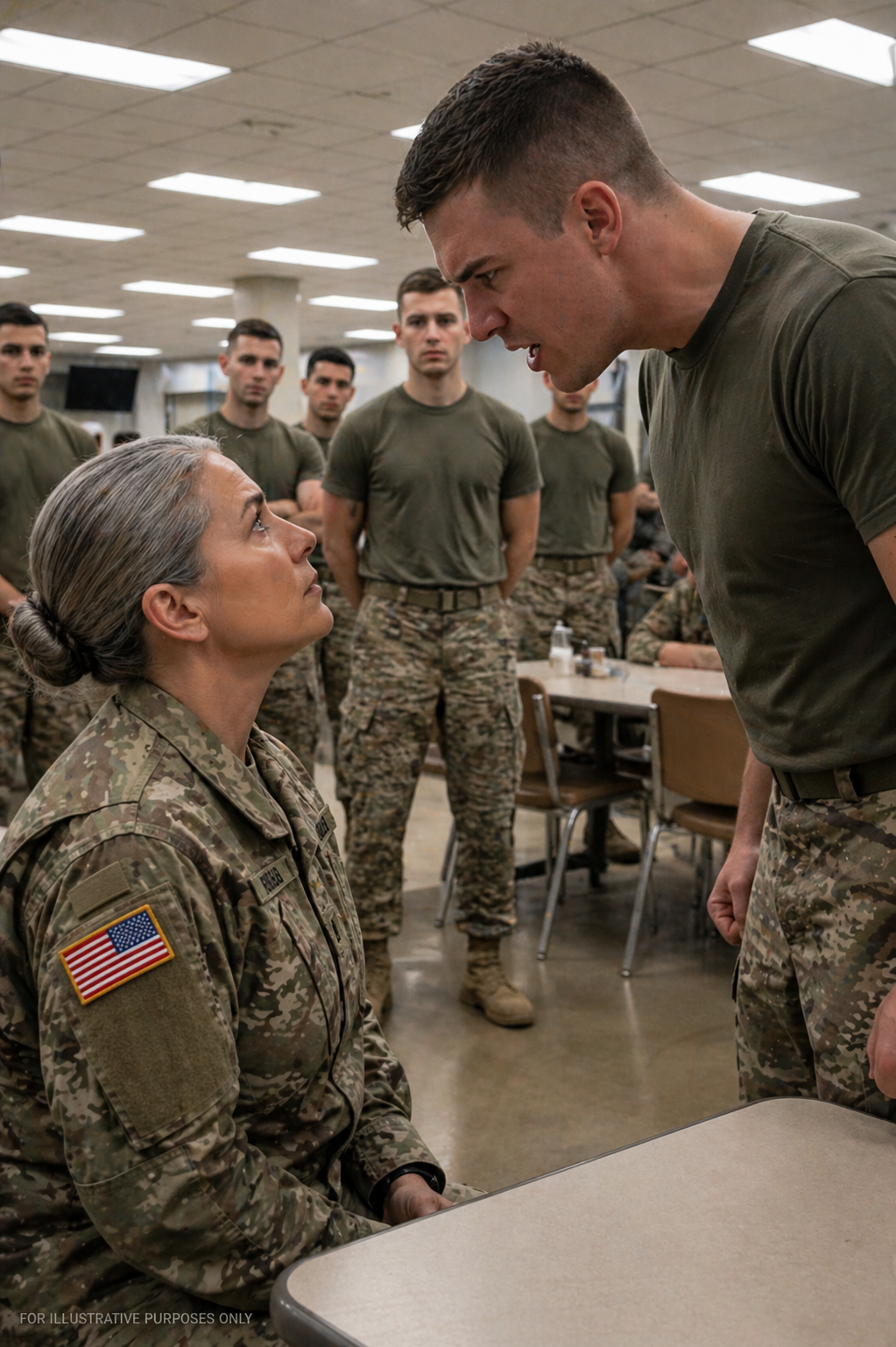 At Fort Bragg, the mess hall was loud in the way only military spaces could be—metal trays slamming, boots grinding against tile, laughter with too much edge in it, orders barked from one end of the room to the other like every sentence needed to win a fight. And in the far corner, beneath a flickering fluorescent panel that buzzed like a trapped insect, a woman sat alone with a bowl of chili that had already gone lukewarm. She looked forgettable at first glance. That was the trick. She wore…