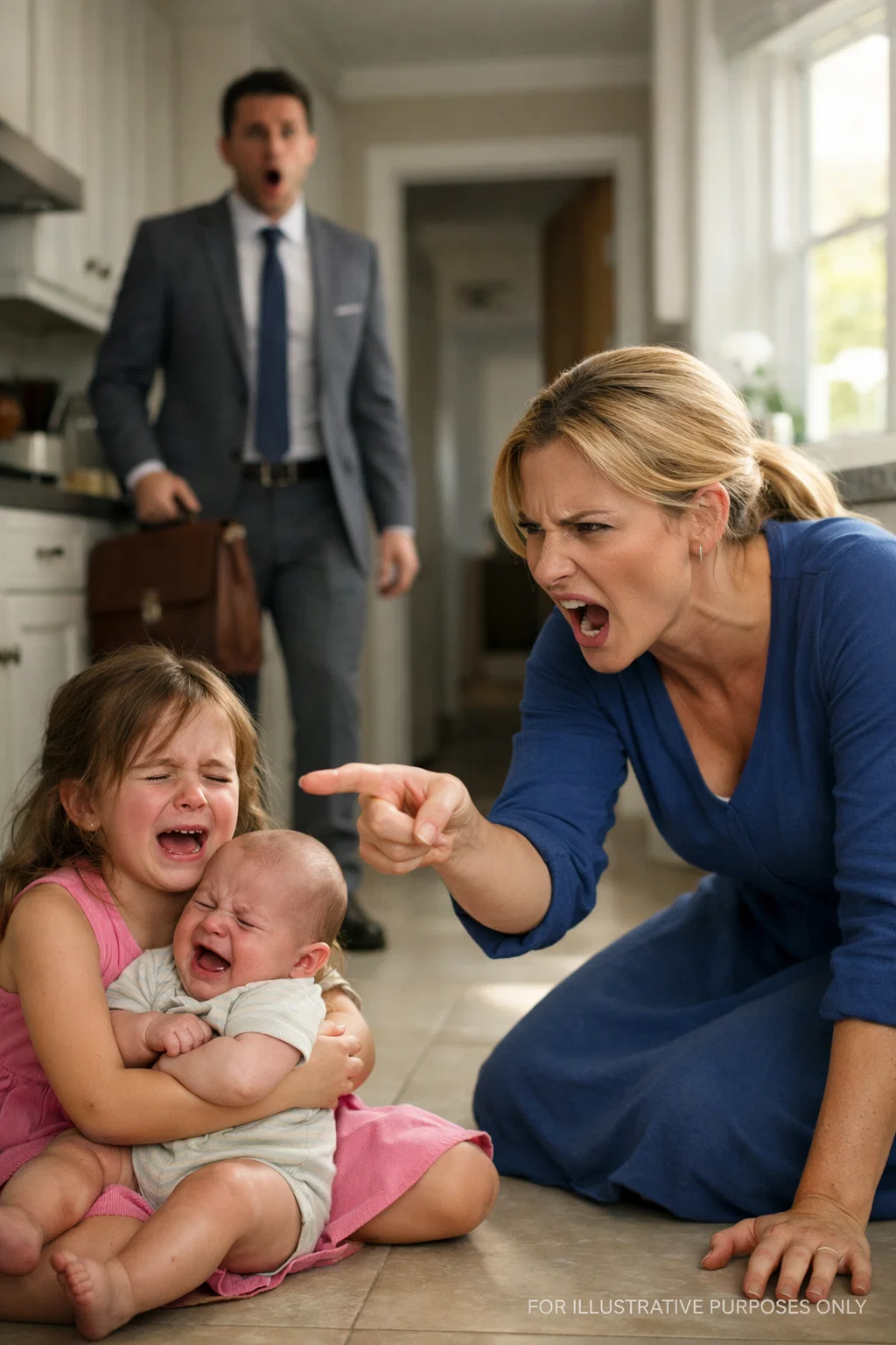 Six-year-old Harper stood between the kitchen island and Miles’s high chair. Her small arms were spread wide as if she were shielding something precious. In the high chair, baby Miles’s cheeks were wet with tears, his fingers clenched around nothing. A puddle of milk spread across the glossy floor, dripping from an overturned sippy cup.