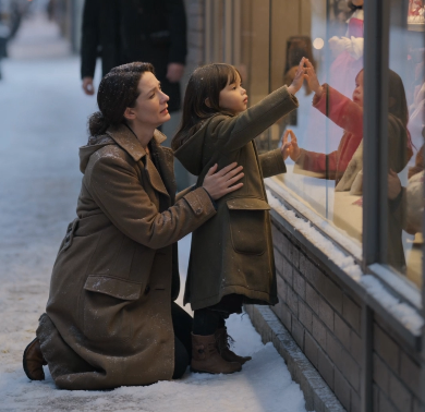 The toy store lights glowed behind them, warm and golden against the freezing blue street, and suddenly the doll in the window didn’t matter anymore.