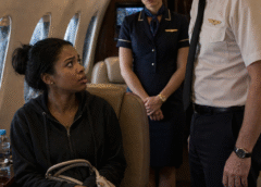 The woman stood up and took a step back. At that moment, the flight attendant also came over—with folded hands, concerned but certain of her actions.