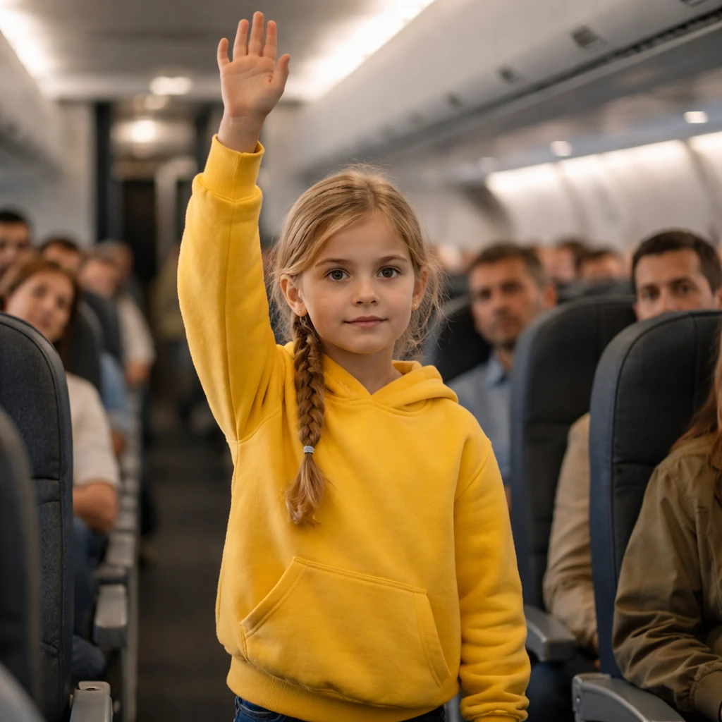 When she reached ten and still nobody moved toward the front, she unclipped her seat belt. The metal tongue clicked free with a small neat sound no one heard. She stood up in the aisle. She was slight for her age, wearing a yellow hoodie with a cartoon sun on the chest, dark leggings, and sneakers with worn toes. Her hair was in two braids. She looked exactly like what she appeared to be: a child on a long flight, up too late, in the wrong place at the wrong time.