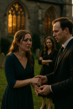 He hesitated, then nodded toward the far side of the churchyard. My stomach dropped. Standing near the garden, her arms crossed, was a woman I didn’t recognize. Tall, striking, her eyes locked on us with an intensity that made my skin crawl.