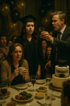 After the ceremony, we all gathered in the reception hall, balloons bobbing, tables covered with cake and soda. My friends hugged me, my grandparents kissed my cheeks, and I thought, This is perfect. Then my dad cleared his throat and tapped his glass with a fork. “Can I have everyone’s attention?” he said. His voice boomed, confident. People turned, smiling, expecting a proud father’s speech. I smiled too—until I saw my mother’s face. She froze, her eyes wide, her lips pressed tight. Something in me shifted. Something wasn’t right.