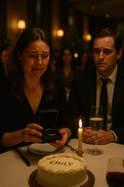 At first, I blinked, hoping my eyes were tricking me. But the letters were clear, carved into the metal with intention. “Who’s Emily?” I asked, my voice thin as glass. He froze, his smile collapsing, his hand tightening around his glass. “It’s a mistake,” he stammered. “The jeweler—he must’ve…” My throat burned as I interrupted, “Don’t lie. Not here. Not now.” The table between us became a battlefield, the candlelight suddenly harsh, exposing every crack in his face.