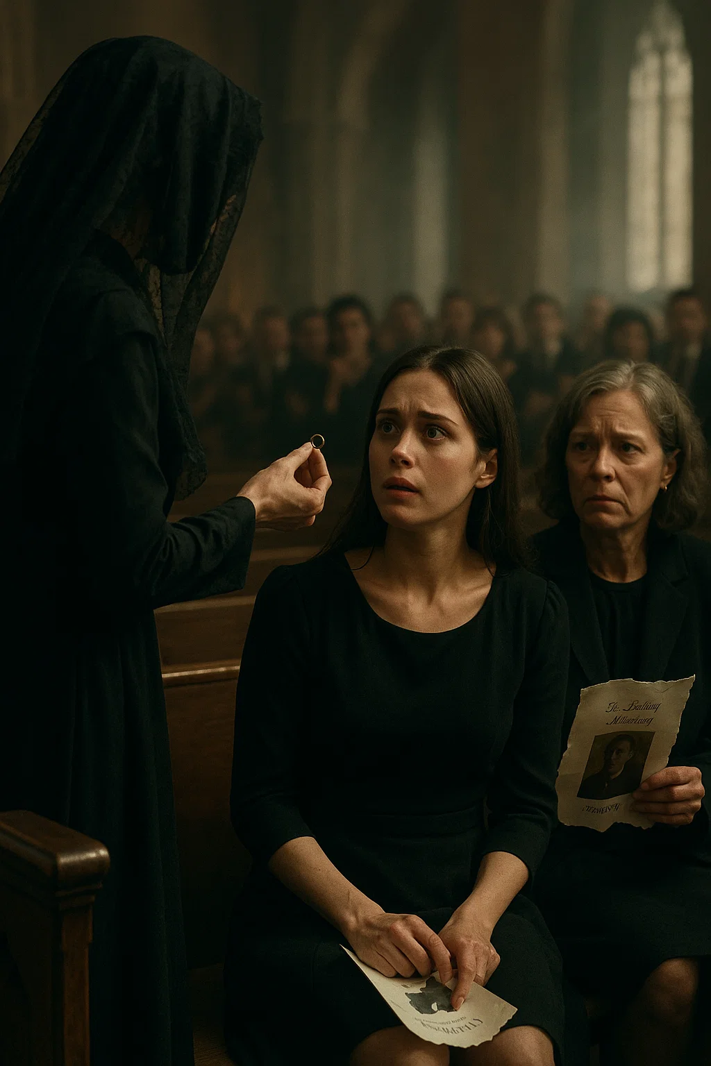 She appeared in the aisle like a ghost—slim, poised, her black veil pulled back to reveal red-rimmed eyes. She didn’t hesitate. She walked straight to me, her heels clicking against the floor, and placed a hand on my arm.