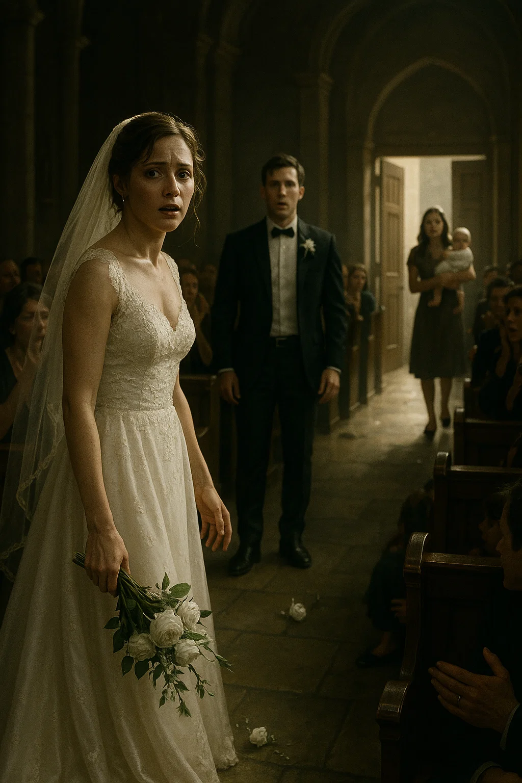 Everyone gasped. The air seemed to shift, thick with whispers. My hand, still clutching my bouquet, felt suddenly heavy. I had imagined every possible disaster—tripping down the aisle, forgetting my vows, even fainting under the heat of the lights. But nothing prepared me for this. My groom’s body stiffened, his lips parted but no words came out. The baby squirmed in the woman’s arms, letting out a soft cry that echoed through the church louder than the music. My heart thudded so hard it almost drowned everything else out.
