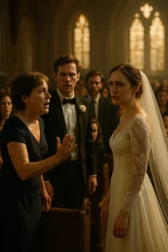 Just as the priest asked if anyone had reason we should not be wed, Lorraine’s chair scraped loudly against the stone floor. Every head turned. She stood there in a navy dress, pearls clutched at her throat, breathing as though she’d run a marathon. “I can’t let this go on,” she said. Her voice quivered, but her words cut through the church like glass.