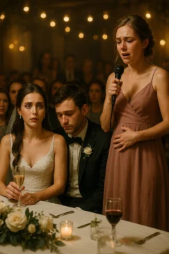 The music had just softened, glasses raised in celebration, when she cleared her throat. My maid of honor. My best friend since childhood. She stood in her lavender dress, her hand trembling slightly as she held the microphone. At first, I thought it was nerves. Public speaking had never been her strength. But then she looked at me, her eyes shimmering with something darker than joy, and said the words that detonated my wedding day: “I can’t keep this secret anymore. I’m pregnant… and he’s the father.”