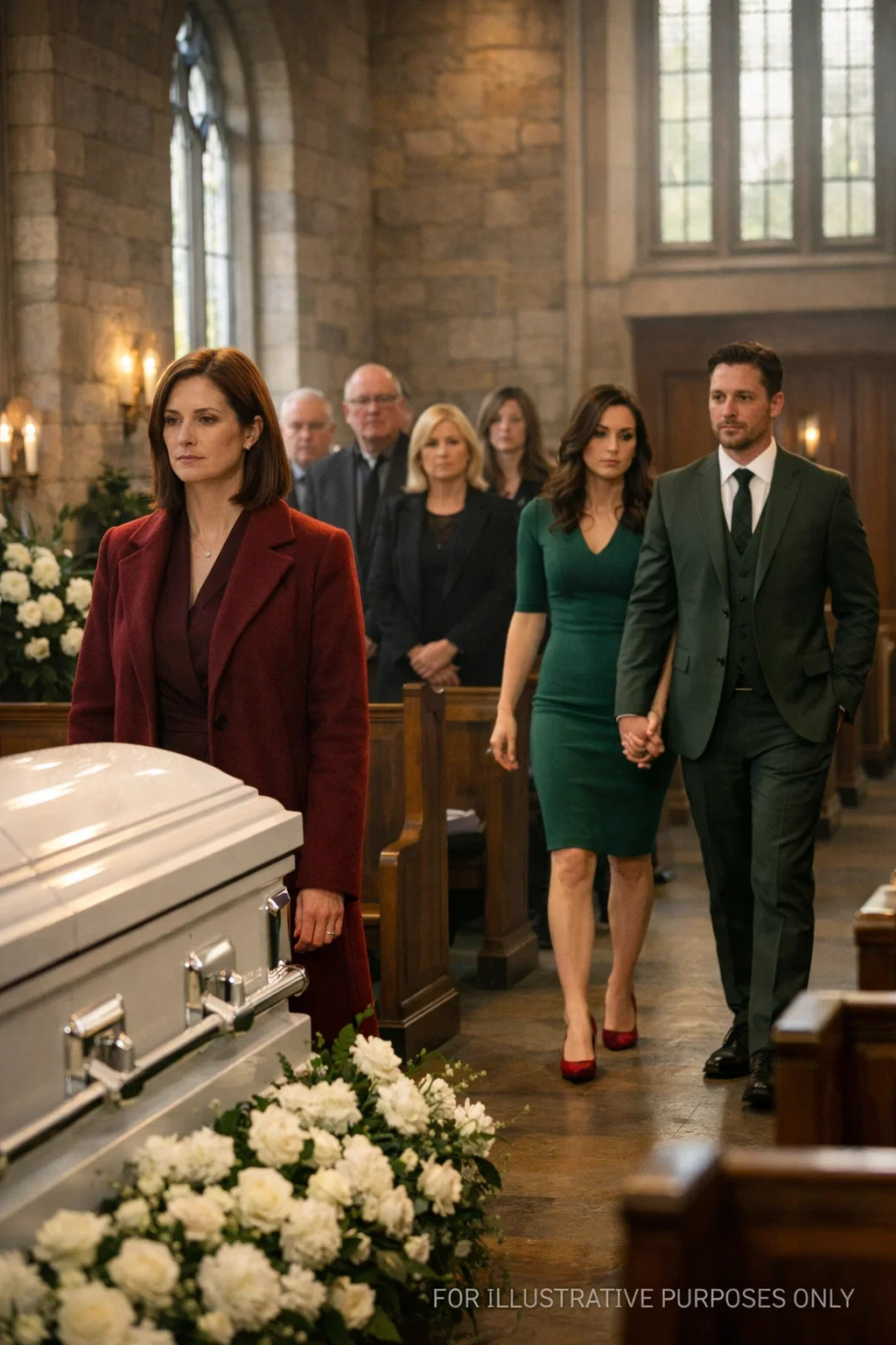 The whisper spread instantly. A cold tension filled the chapel, as if the air itself had shifted. The white flowers, the scent of melted candles, even the quiet prayers couldn’t soften the impact of those words.
