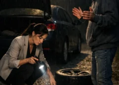 She wore nice clothes, the kind that looked too clean for a county road after midnight, and shoes nobody in their right mind would wear while crouching beside a busted tire.
