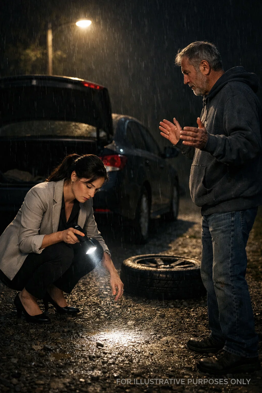 The woman had her phone wedged between her shoulder and cheek, flashlight pointed down toward a rear tire that had gone completely flat.