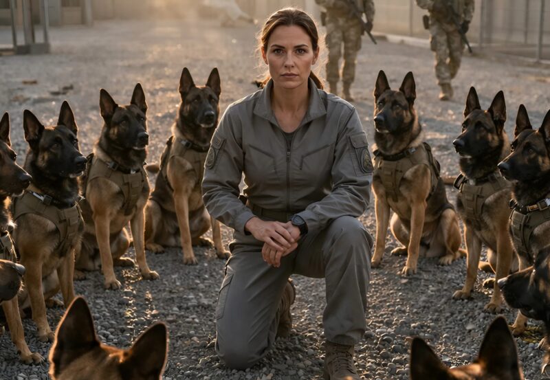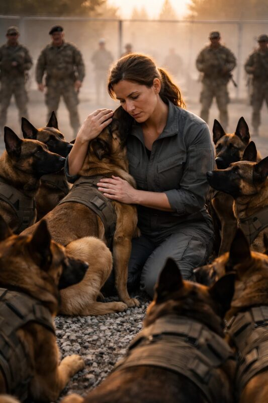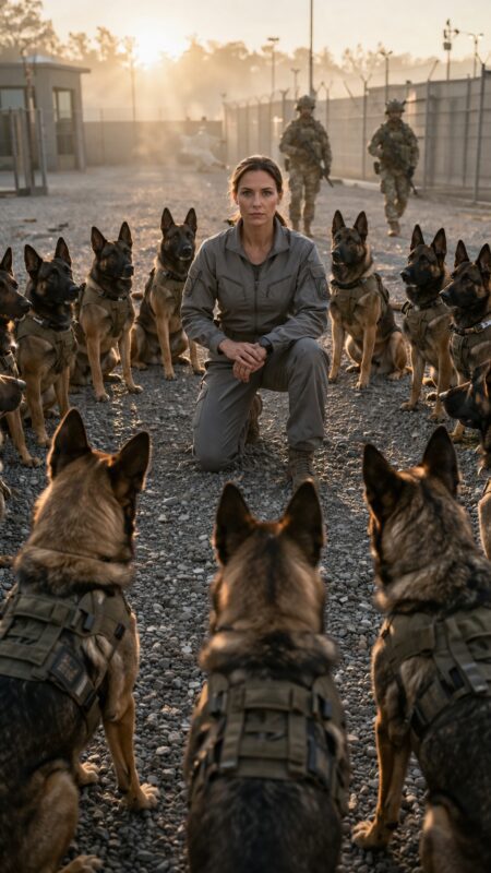 A sharp gesture with the hand—and in seconds, fifteen service dogs were brought into the area. Large Belgian Malinois in tactical harnesses moved with precision and coordination, like a single machine. The leashes tightened, their paws planted firmly on the gravel, their eyes fixed on the target.