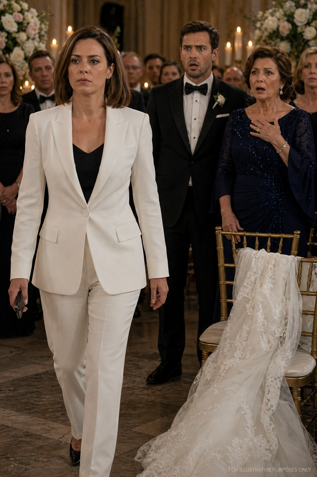 Guests froze, unsure what to do. Some leaned forward in their chairs, others just stared. My mom’s hands flew to her mouth, eyes wide, trying to process why her daughter stood beneath the wedding arch looking like a lawyer instead of a bride.