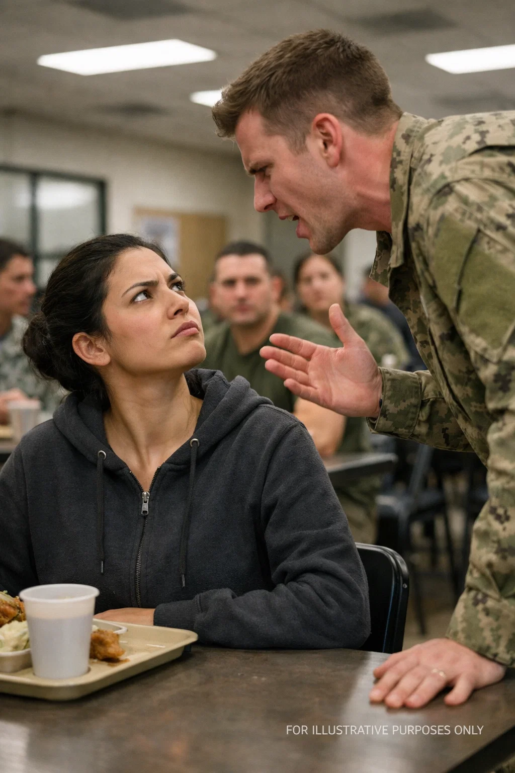The chow hall at Camp Redstone was loud in the ordinary way only military places could be—metal trays slamming against counters, boots squeaking on polished floors, chairs scraping back in impatient bursts, and the constant hum of men and women eating fast because time always belonged to someone else. Outside the long window beside my table, the winter sun glared against the concrete walkways and turned everything pale and hard. Inside, the air smelled like coffee, bleach, steam, and overheated food.