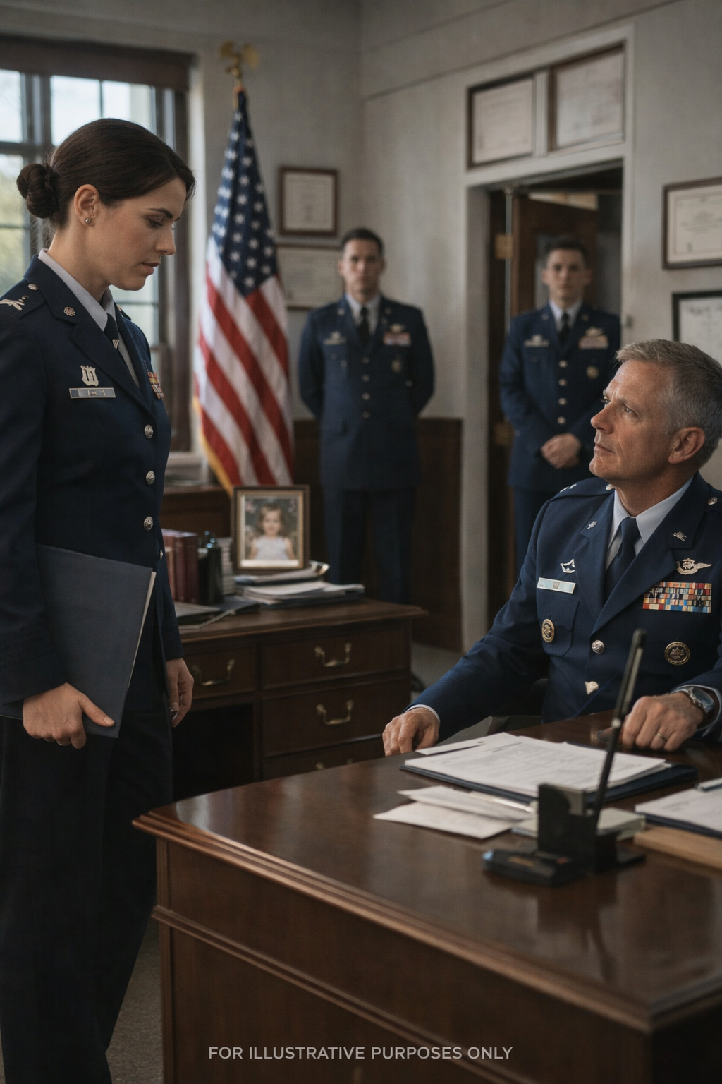 The general—Robert Alden—was known across the corps. A man of perfect posture and precise words. The kind of leader who could command silence just by walking into a room. I’d admired him once from afar during my cadet years. Now I stood in his office, shaking like a recruit. He motioned me to sit.