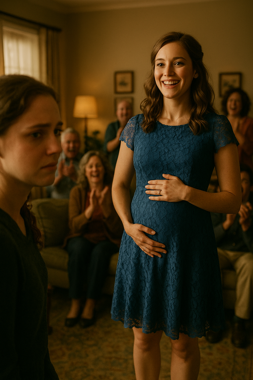 The room erupted in cheers. People clapped, gasped, rushed to hug her. My aunt cried into her napkin. My uncle patted her back proudly. Everyone gathered around her, cooing and fussing, their joy swallowing the room whole.