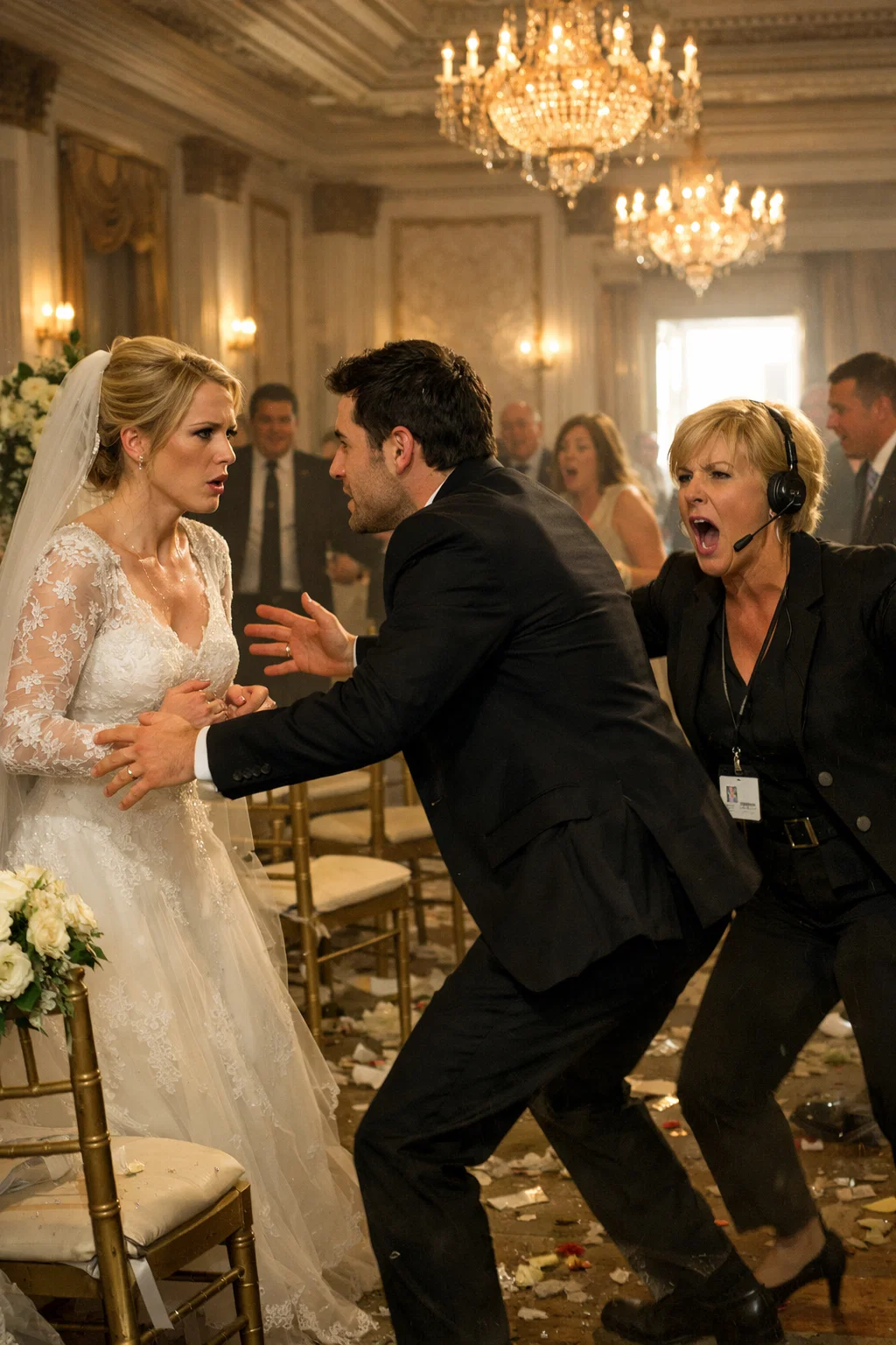 A woman near the second row fell—two groomsmen dove to pull her up before she was crushed. Claire’s maid of honor grabbed her and dragged her toward the side exit so hard her heel nearly snapped.