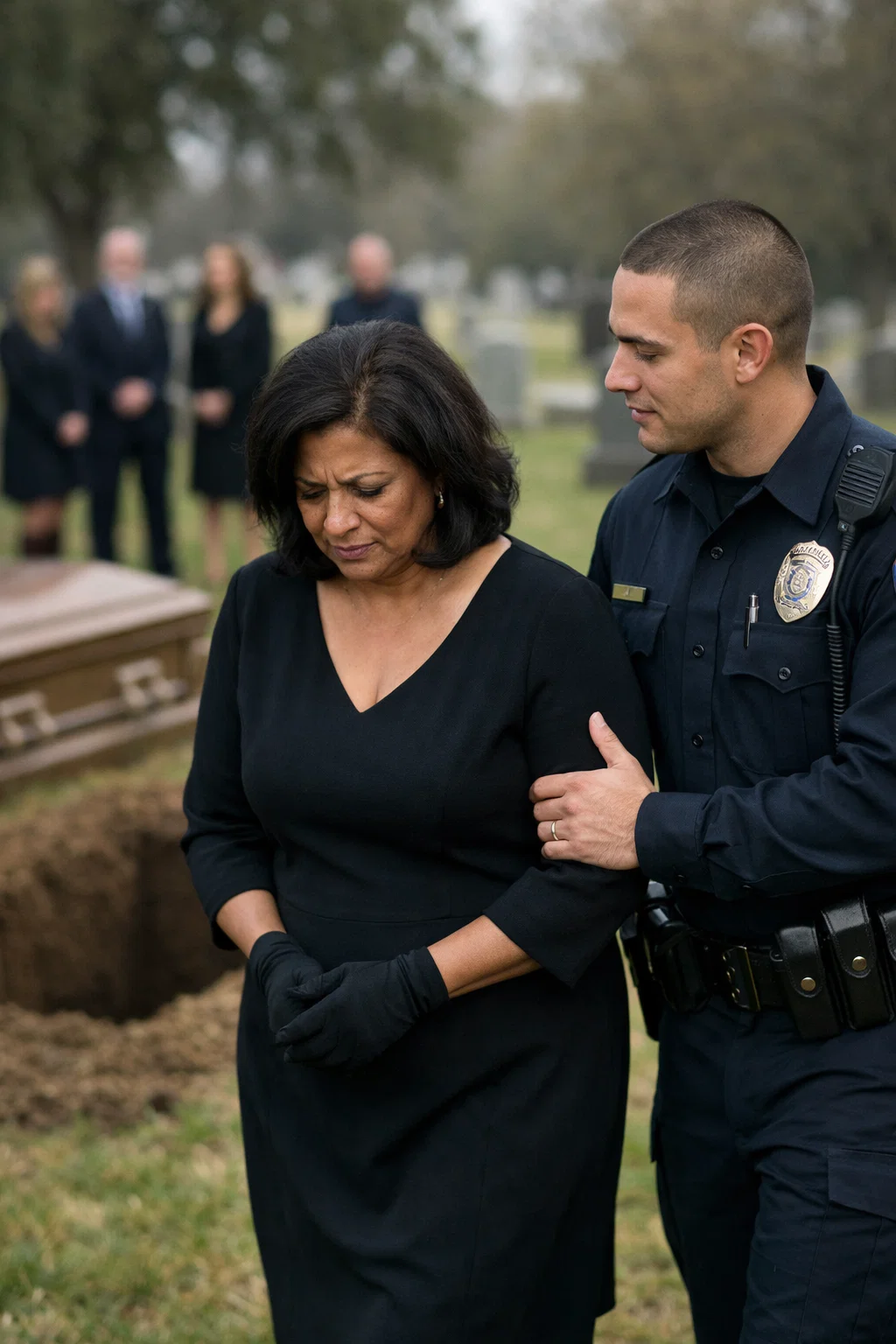 A patrol car rolled up too close—too fast—like the driver had mistaken a funeral for a traffic stop. The door opened hard. Officer Connor Hayes stepped out, scanning the mourners as if he was looking for trouble he wanted to find.