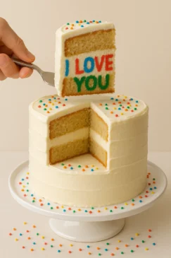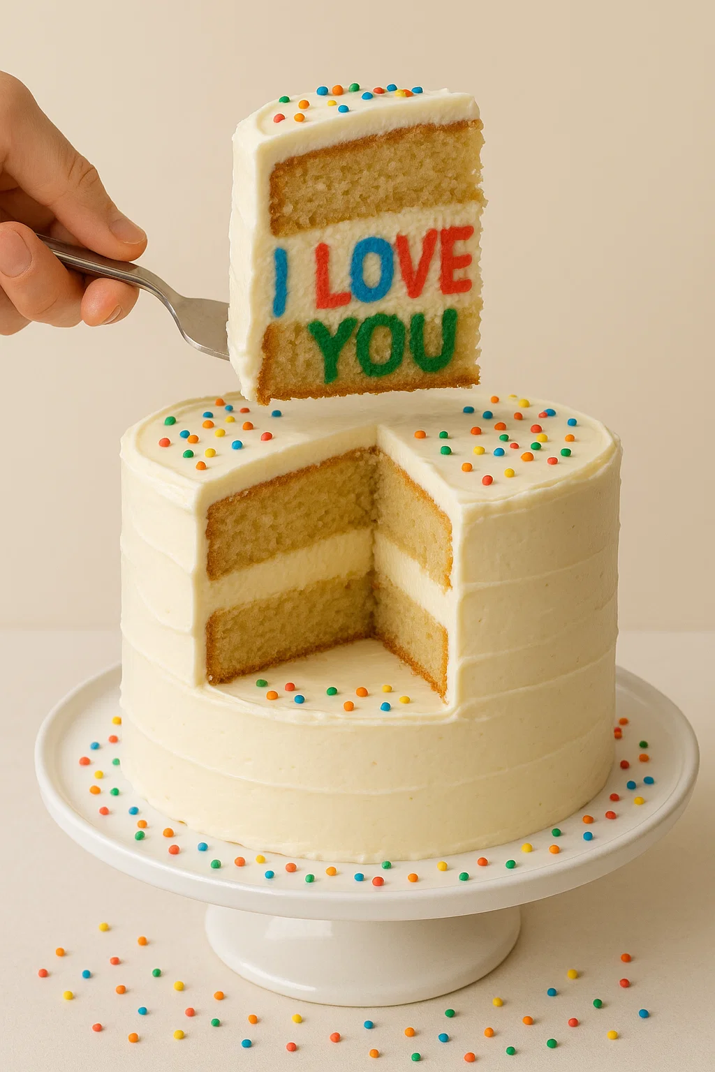 There, in a thin layer of red frosting hidden between the cake layers, were the words: I love you, Chris.