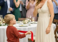 The boy stepped closer again, his small hand still holding the ribbon. His voice dropped to a whisper, but it carried with unmistakable weight.