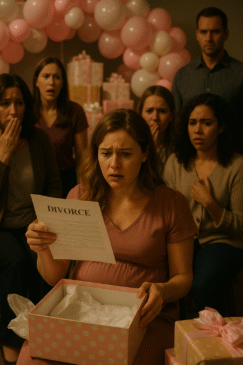 When my friends planned my baby shower, I expected balloons, laughter, and pastel-colored gifts. I expected tiny clothes, stuffed animals, bottles, and blankets. What I didn’t expect was to open one box and find my entire life ripped apart, tucked neatly beneath tissue paper. Because instead of rattles or pacifiers, the box held divorce papers—signed, stamped, and waiting.