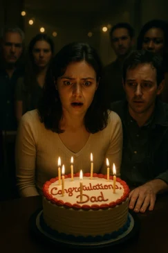 Birthdays are supposed to be simple. Cake, candles, laughter, family gathered around a table. Mine started that way, with the warm glow of candles and the sound of voices singing to me. I leaned forward, ready to make a wish, when my eyes landed on the frosting. Four words, written in cheerful blue icing, stole the air from my lungs: Congratulations, Dad.