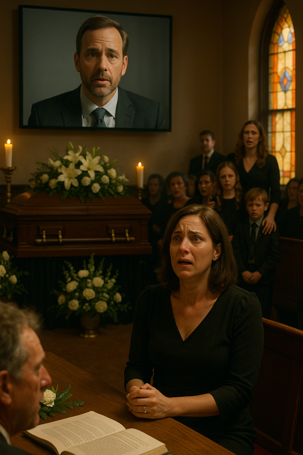 The chapel was draped in silence, broken only by the sniffles of mourners and the low hum of the organ. His casket sat at the front, surrounded by flowers, photos, and memories carefully chosen to honor the man I thought I knew. I sat in the first pew, my black dress clinging uncomfortably, my hands clutching tissues that were already damp. The service moved along as expected—the pastor spoke of grace, friends shared anecdotes, and I prepared myself for the final goodbye. But then the screen flickered to life.