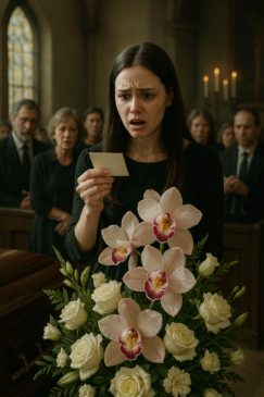 The church was quiet except for the shuffle of footsteps and the soft hum of the organ. My father’s coffin rested at the front, surrounded by lilies and roses, their perfume thick enough to sting my eyes. People whispered condolences, shook my hand, hugged me with trembling arms. I moved through it all in a haze, clinging to routine to avoid drowning in grief. Until I saw the flowers. A massive arrangement, white orchids laced with ribbon, sitting right by his casket. The card tucked inside carried a name. But not his. Not my father’s.
