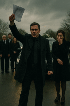 The hearse driver braked sharply, confusion rippling down the line of cars. The man’s face was pale but determined, his eyes blazing as he shouted, “Stop this burial! He was my father—and I am his rightful heir!”