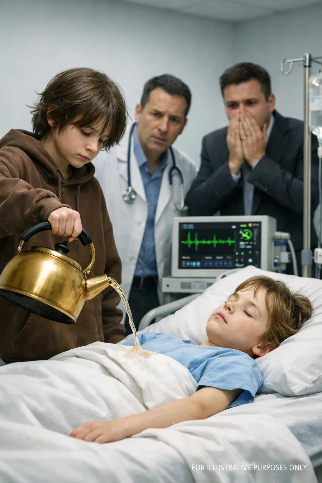 Before Brandon could stop her, she uncapped the bottle and gently poured a few drops of water onto Lucas’s forehead. The water ran down his temple, dampening the pillow.