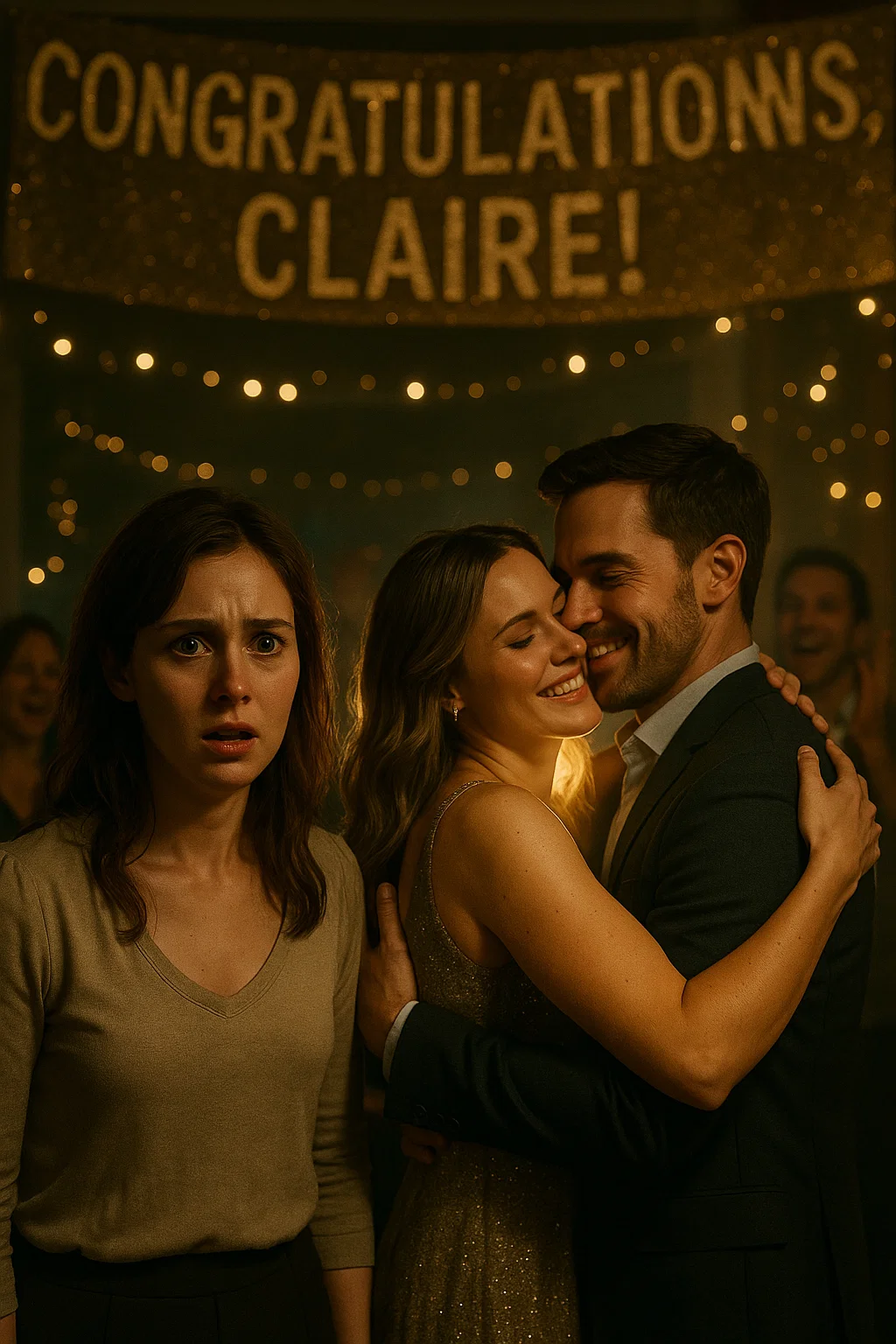 The room erupted in cheers, people clapping and hugging—not me, but her. Claire, standing in the center of it all, radiant, laughing, holding a bouquet of flowers. My husband’s smile widened as he slipped an arm around her shoulders. My stomach dropped so violently I thought I’d be sick.