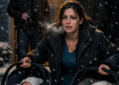 The porch light burned too bright against the dark, catching snowflakes as they spun down in the cold air. My sons—Eli and Owen—were only eleven days old, bundled in two tiny carriers that felt heavier than my whole life. I stood on the front steps