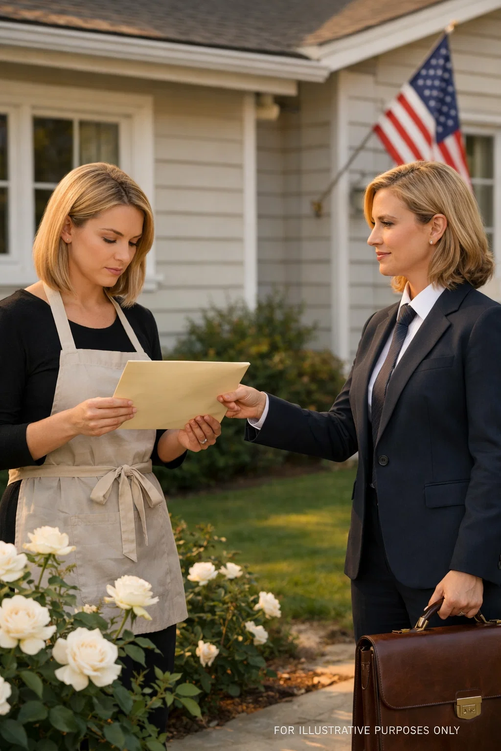 my husband’s new wife came to my door with a greedy smirk. she said we here for our rightful share of your father’s estate; move out immediately. I smiled as my lawyer walked in behind her.